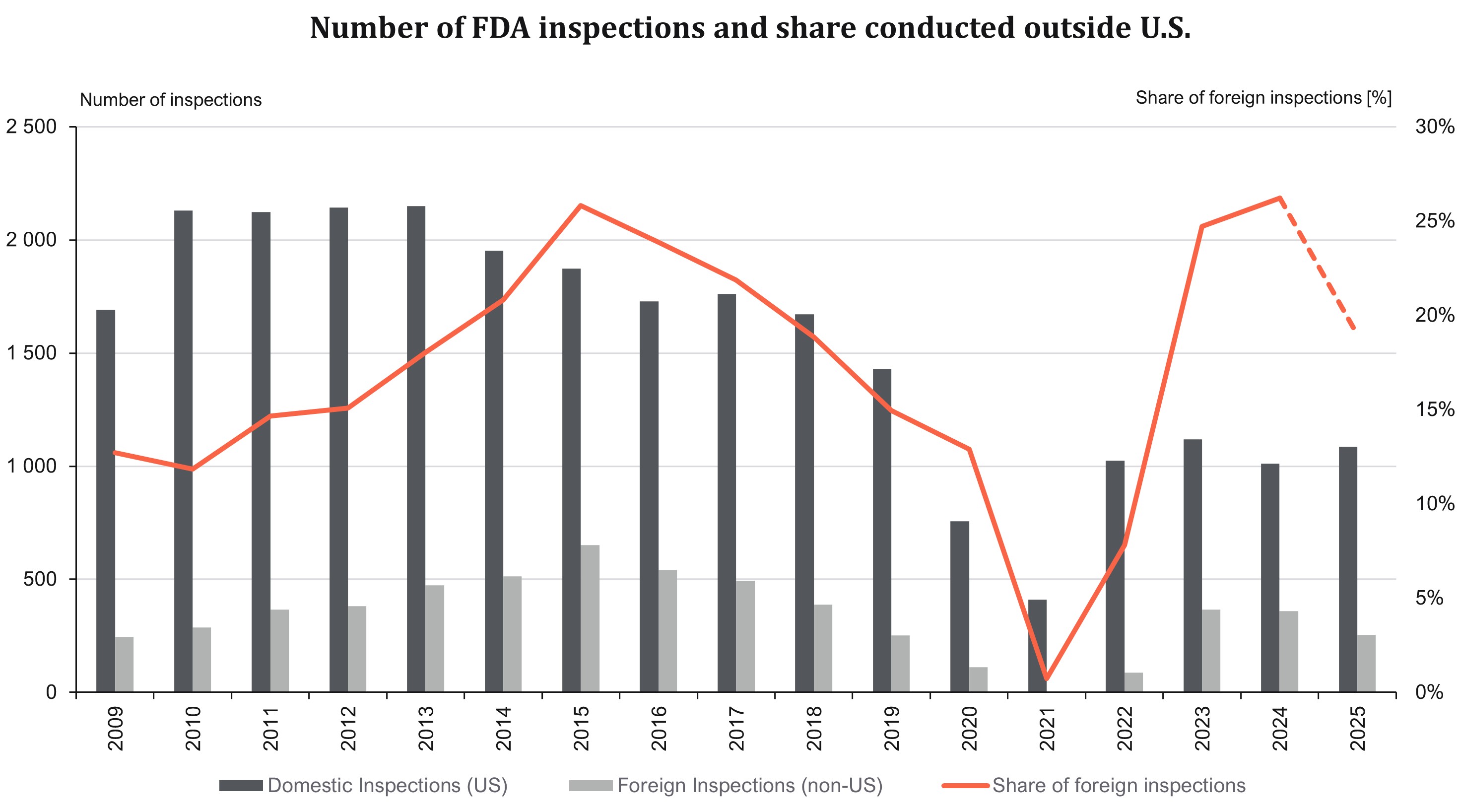 Since the pandemic, the share of foreign inspections has risen to almost 25%, a number not seen since the previous peak of 2015. As 2025 is still ongoing, and has coincided with a prolonged government shutdown limiting FDA resources, the 2025 YTD data is not fully comparable with previous years.