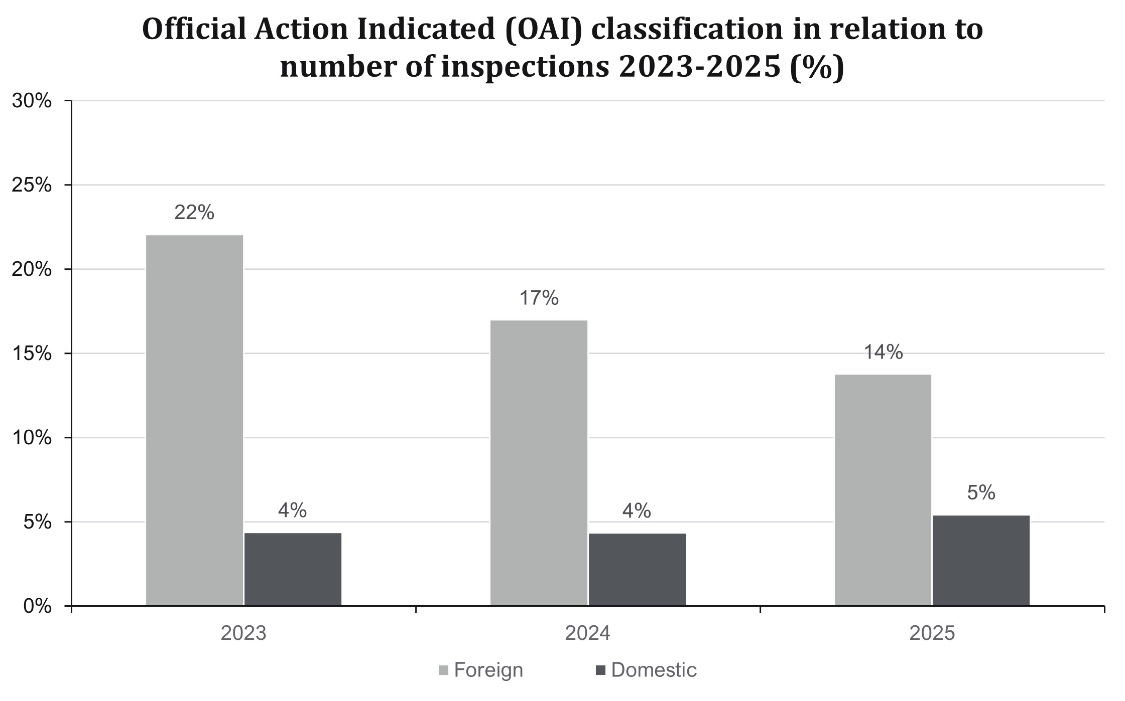 Over 2023-2025, foreign inspections by the FDA have, on average, been nearly four (4) times more likely to result in Official Action Indicated (OAI) classifications than domestic inspections.