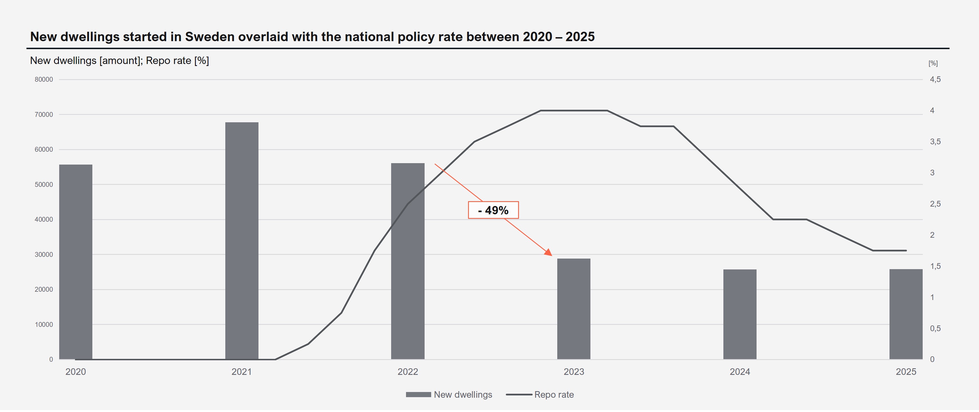 As Swedish inflation rates peaked, tighter monetary policies were implemented to regain control of inflation rates. The sector’s dependency on credit in combination with the rapidly increasing interest rates put the industry in a tail-spin. Initiated housing constructions clearly displays the magnitude of the decline: in 2023, new dwellings initiated suffered a 49% decrease from the year before. The negative trend continues into the following years and persisted into 2025.