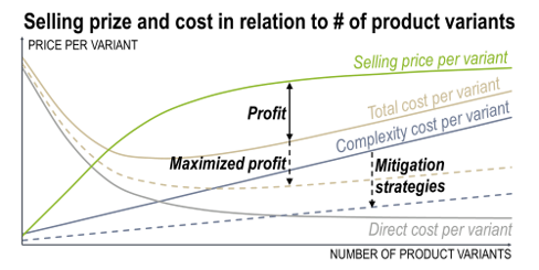 A wide portfolio increases complexity, where added product variants bring complexity costs, despite lowering direct costs per variant. Complexity costs derive from challenges associated with entangled logistics, inflated stock requirements, longer lead times, and required manufacturing flexibility, which must be mitigated to retain delivery lead times and maximize profit gains.